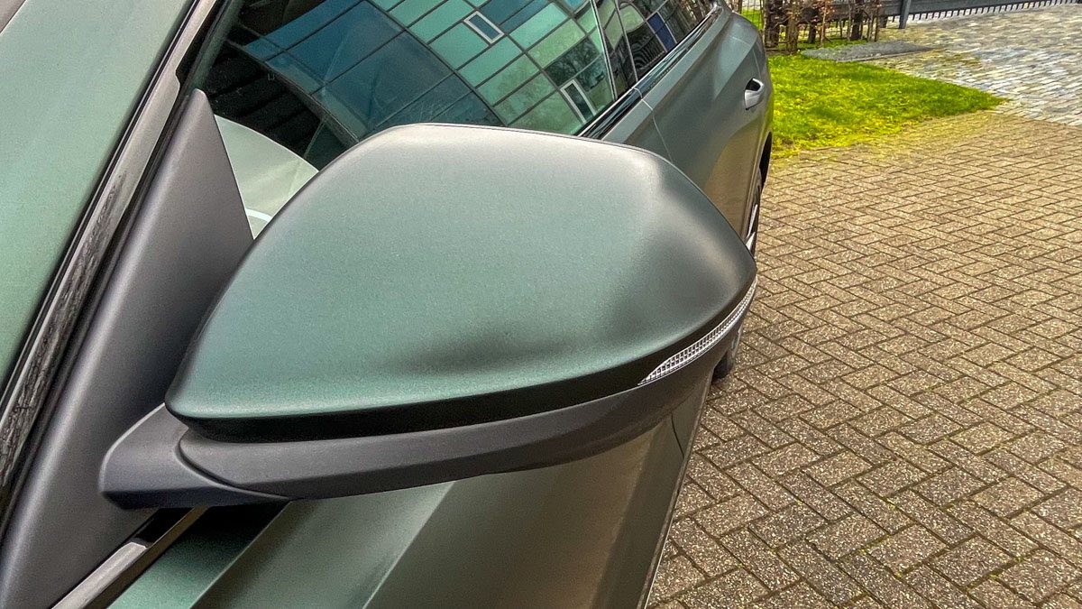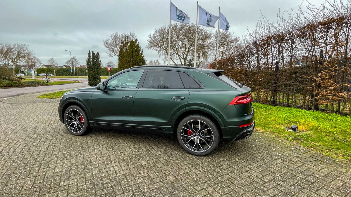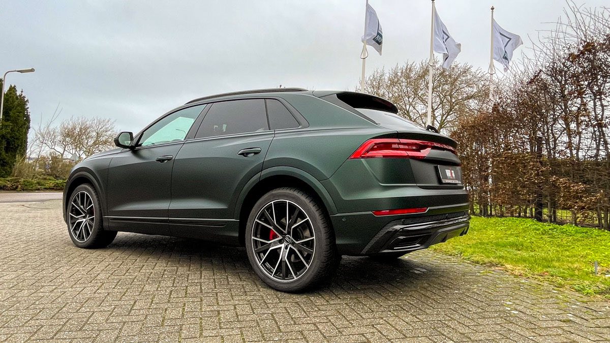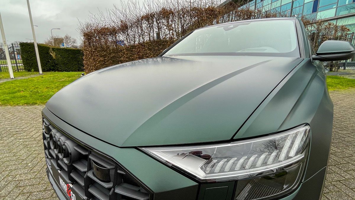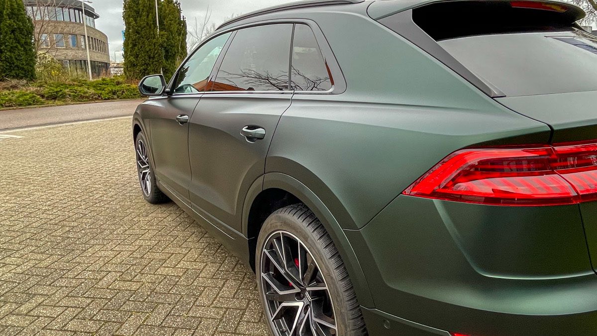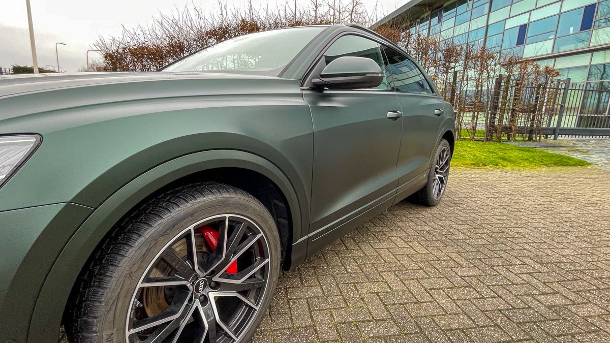 Deze Audi Q8 hebben we volledig gewrapt in KPMF Matte Dark Sage. De matte sage-kleur geeft de auto een stoere, rustige uitstraling en maakt ’m net even anders dan standaard grijs of zwart, zonder té opvallend te worden. Door de matte finish komen de strakke lijnen en brede schouders van de Q8 extra mooi naar voren, vooral in combinatie met de zwarte details en het donkere glas. Ook de sportieve setup met de grote velgen en rode remklauwen sluit hier perfect op aan. Kortom: een superclean resultaat met een chique, maar toch krachtige look.