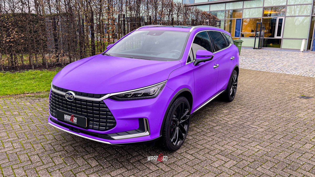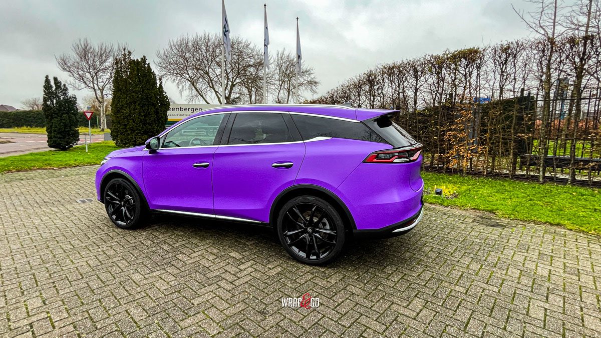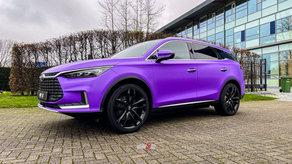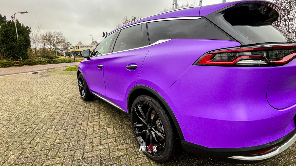 Deze BYD Tang hebben we volledig ingepakt in 3M Matte Purple, en dat geeft ’m meteen een heel andere uitstraling. De matte finish maakt de kleur strak en rustig, terwijl hij in het daglicht juist lekker “popt” en de lijnen van de auto extra mooi laat uitkomen.