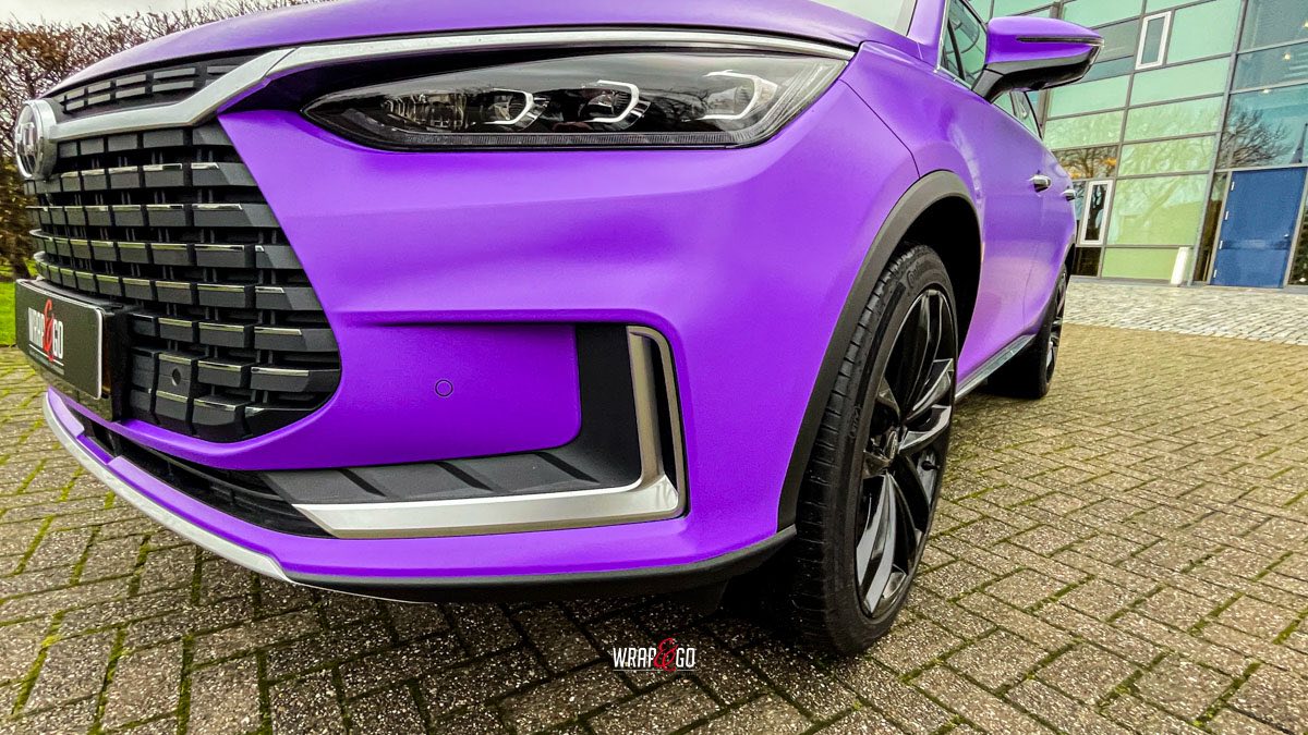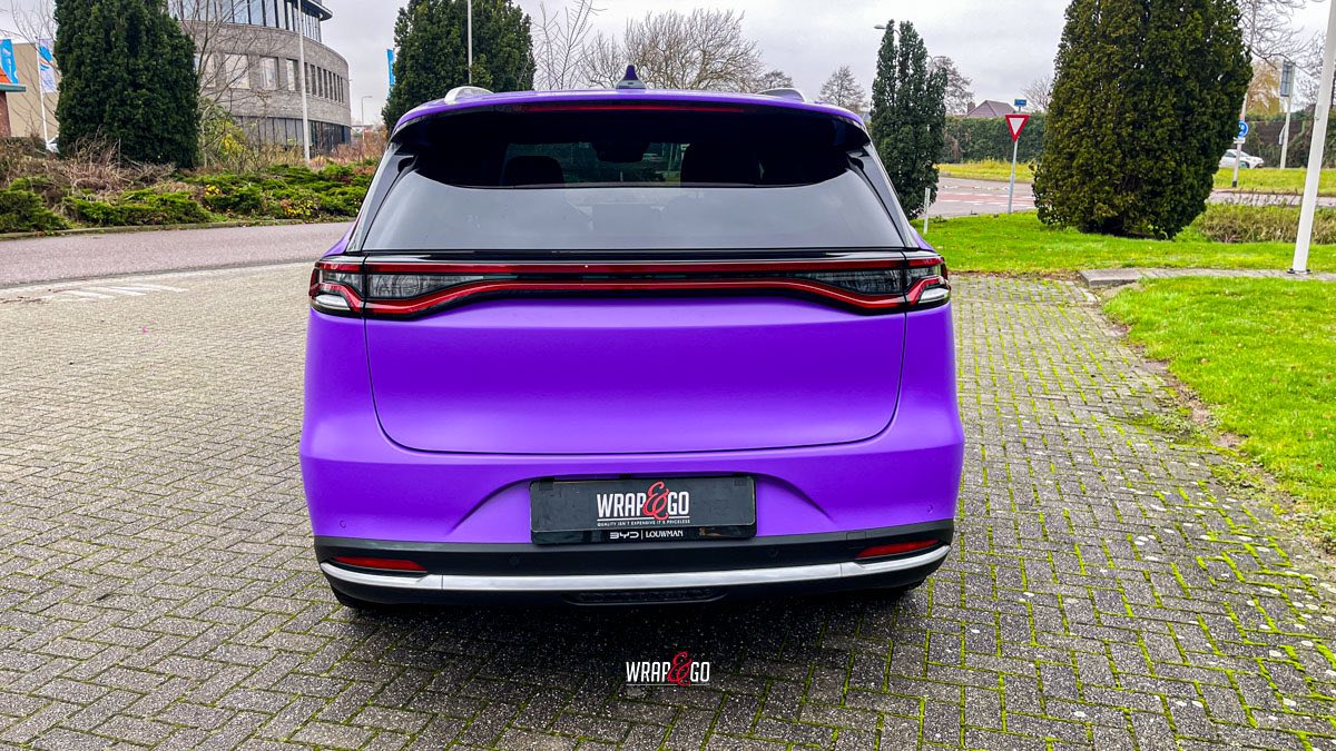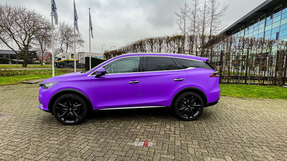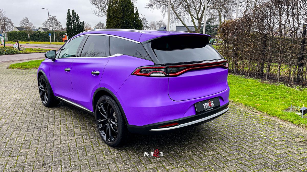 Deze BYD Tang hebben we volledig ingepakt in 3M Matte Purple, en dat geeft ’m meteen een heel andere uitstraling. De matte finish maakt de kleur strak en rustig, terwijl hij in het daglicht juist lekker “popt” en de lijnen van de auto extra mooi laat uitkomen.