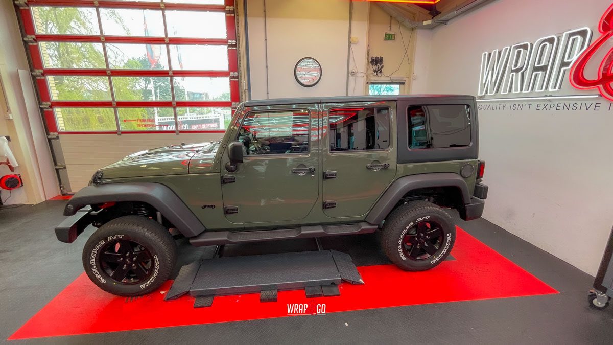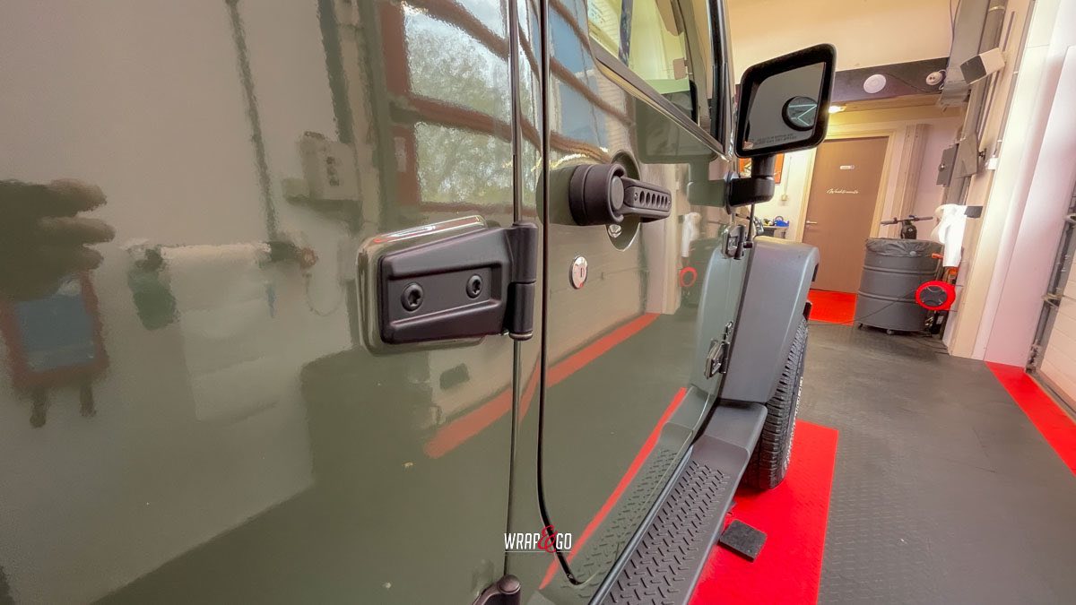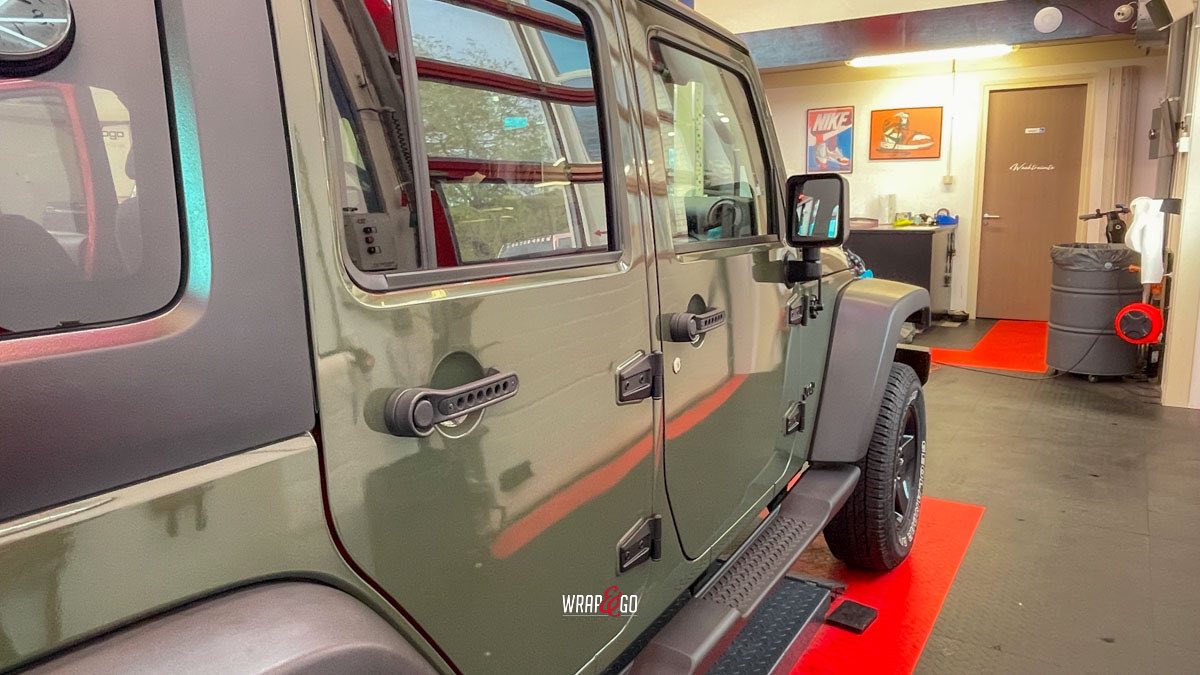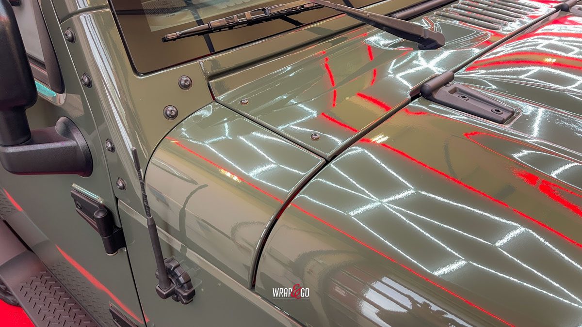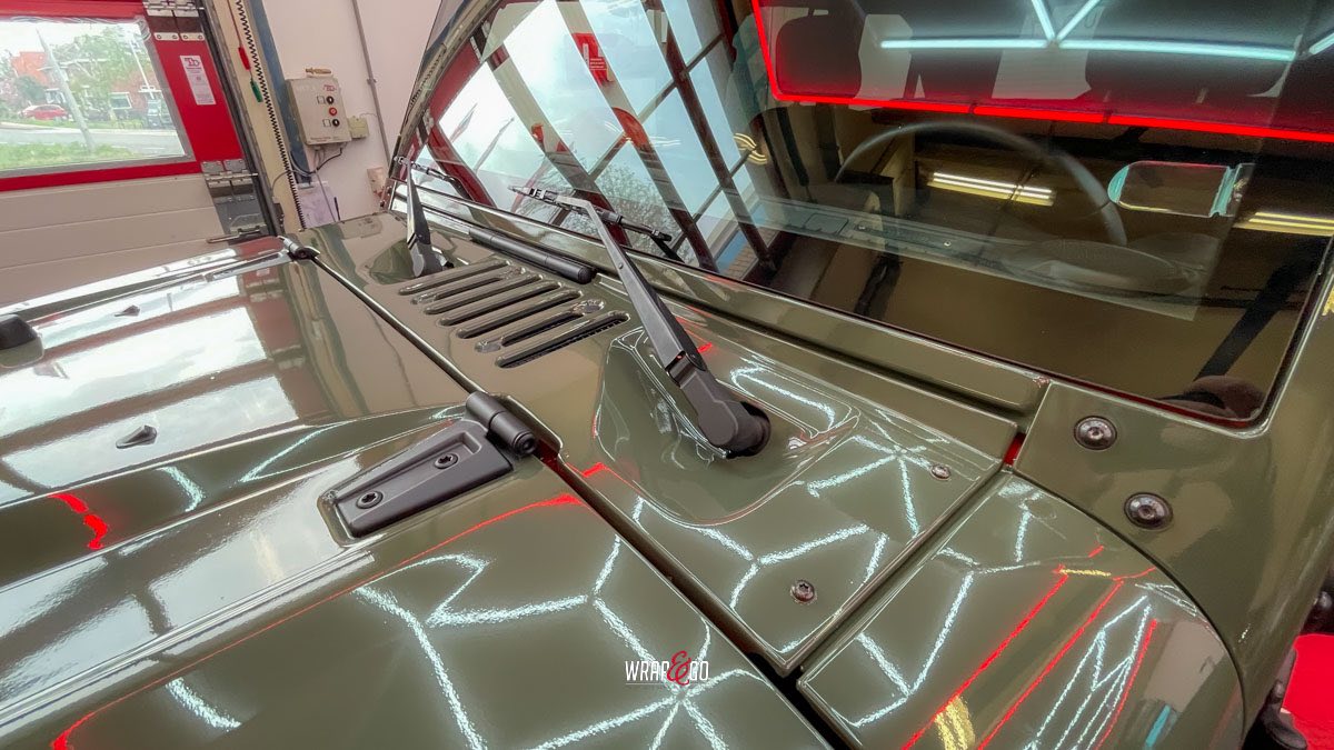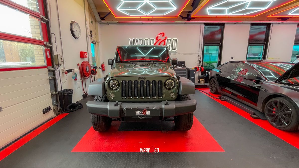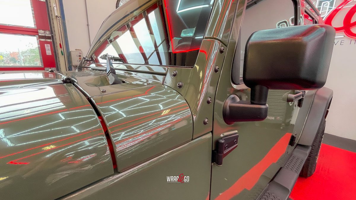 Deze Jeep Wrangler hebben we voorzien van een APA Ultra Gloss Black Olive wrap. De kleur is precies goed voor een Wrangler: stoer en “military”, maar door de ultra hoogglans finish krijgt ’ie juist veel diepte en mooie reflecties. In de werkplaatsverlichting zie je meteen hoe strak de panelen eruit komen, en ook de details rond de scharnieren, naden en de grille sluiten netjes aan. Het contrast met de zwarte hardtop en de matte kunststof bumpers en spatbordranden maakt het geheel helemaal af: ruig, maar wel clean.