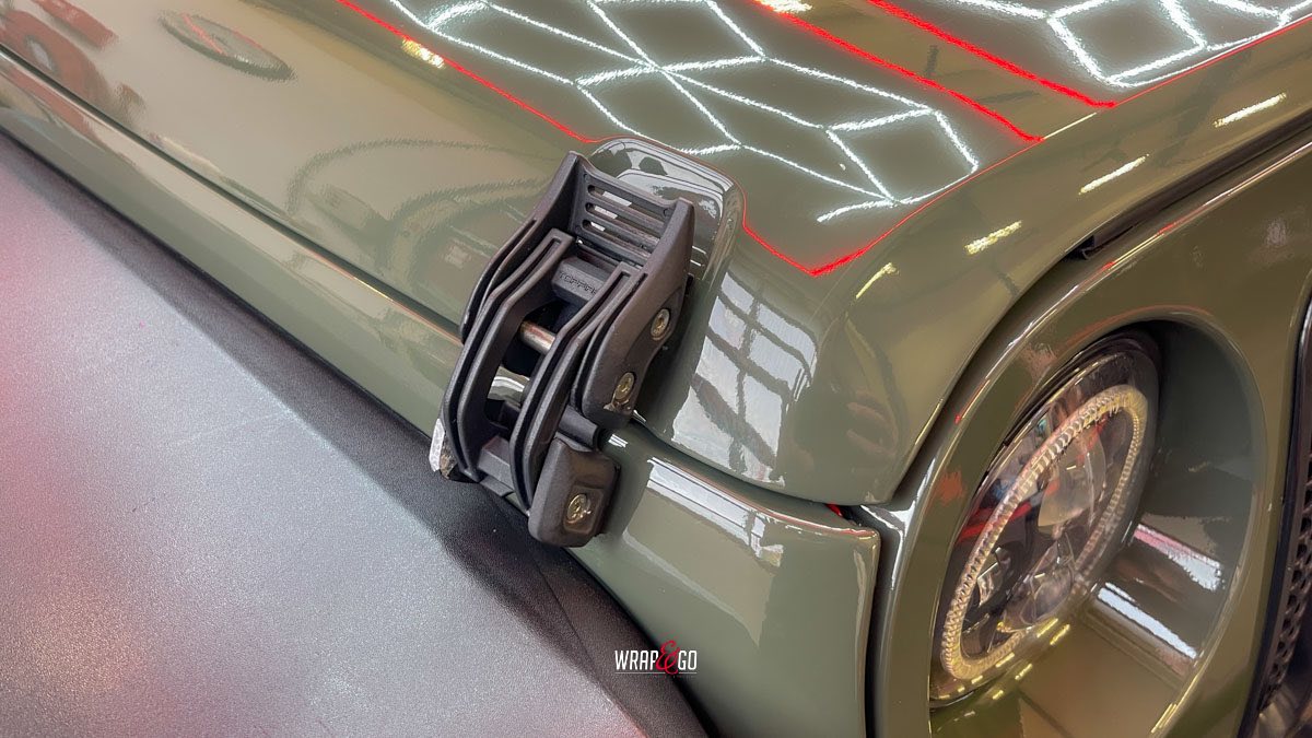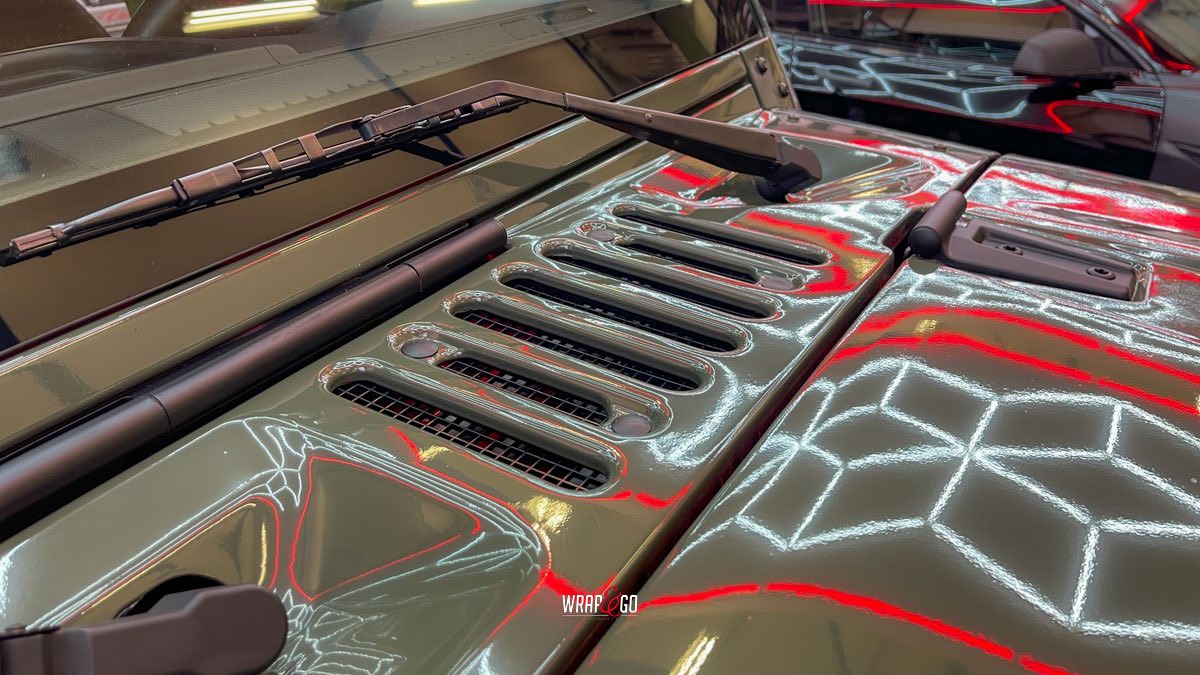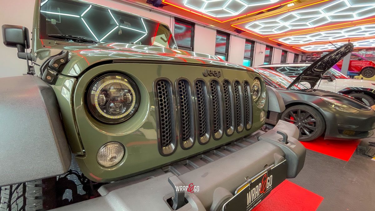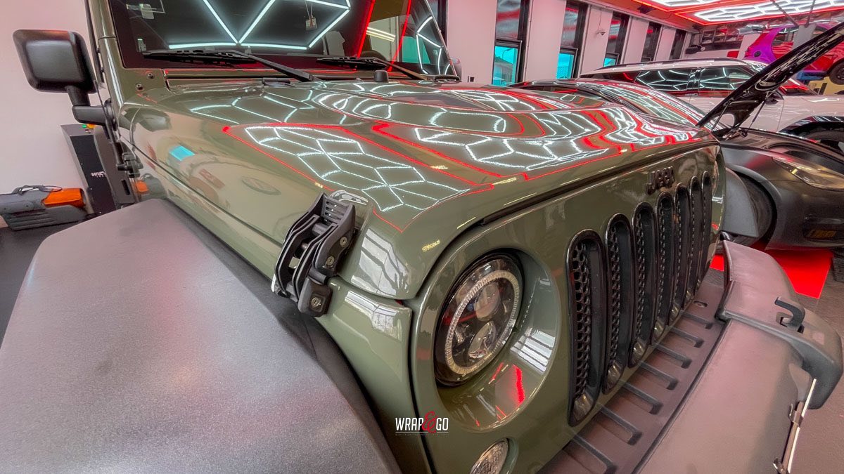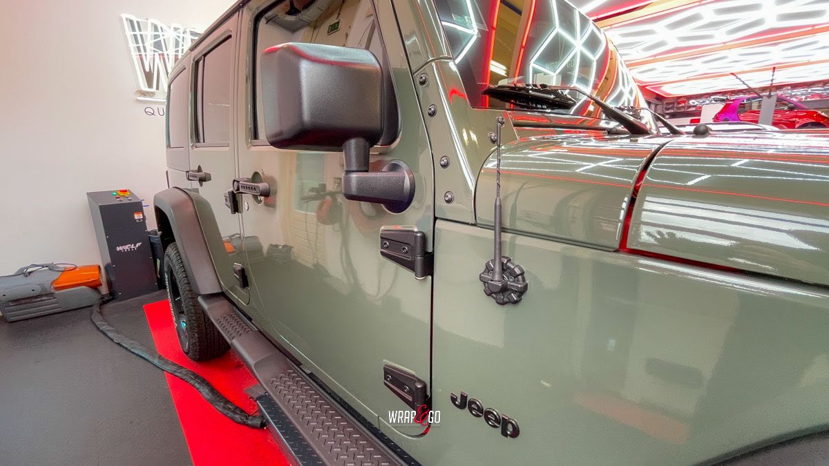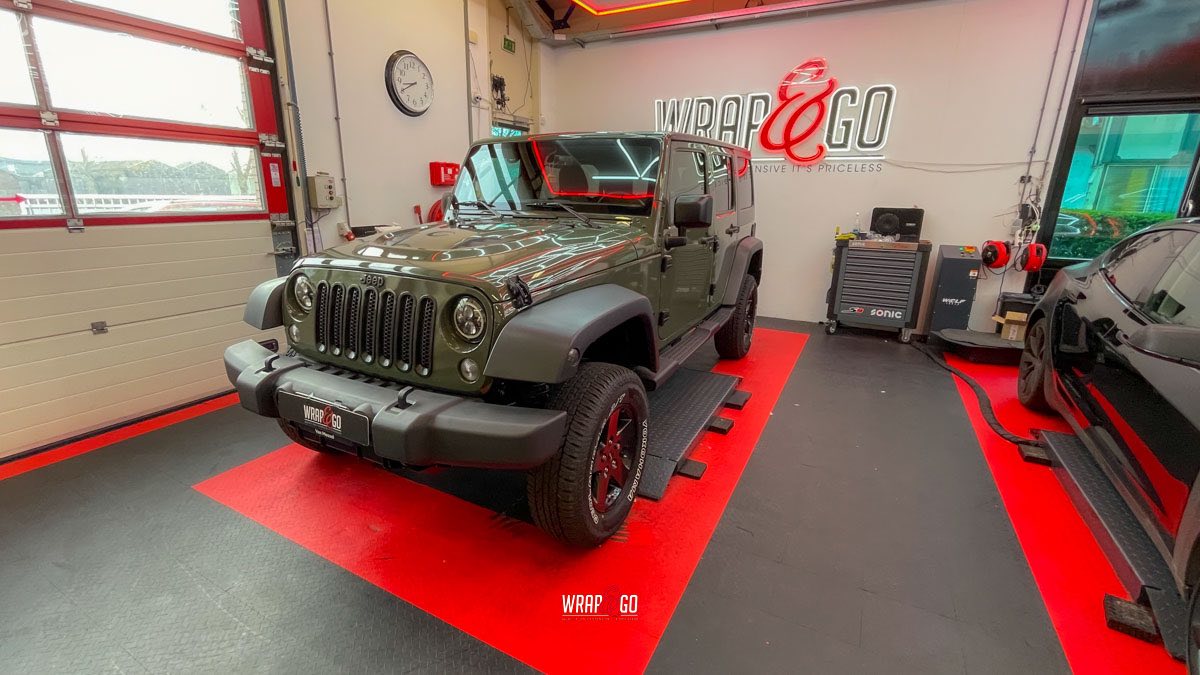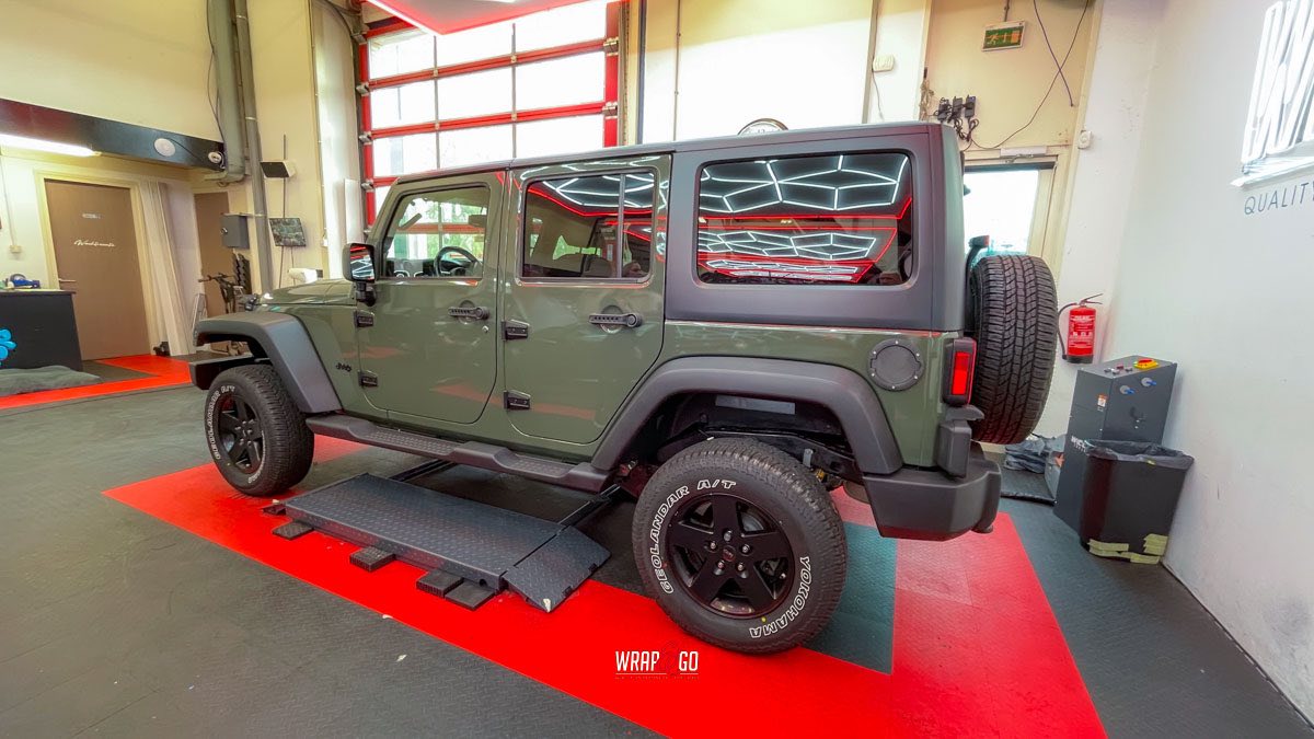 Deze Jeep Wrangler hebben we voorzien van een APA Ultra Gloss Black Olive wrap. De kleur is precies goed voor een Wrangler: stoer en “military”, maar door de ultra hoogglans finish krijgt ’ie juist veel diepte en mooie reflecties. In de werkplaatsverlichting zie je meteen hoe strak de panelen eruit komen, en ook de details rond de scharnieren, naden en de grille sluiten netjes aan. Het contrast met de zwarte hardtop en de matte kunststof bumpers en spatbordranden maakt het geheel helemaal af: ruig, maar wel clean.
