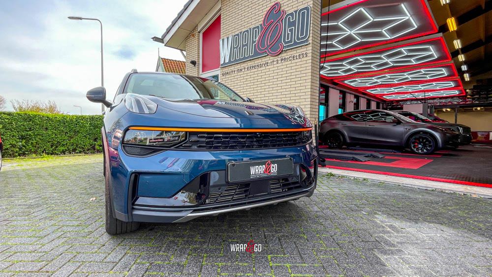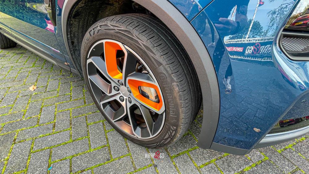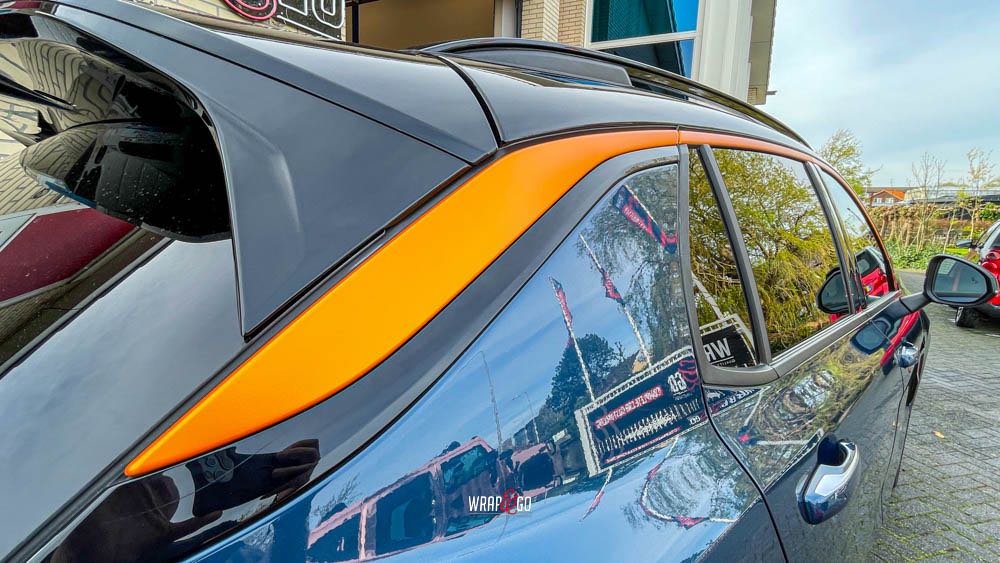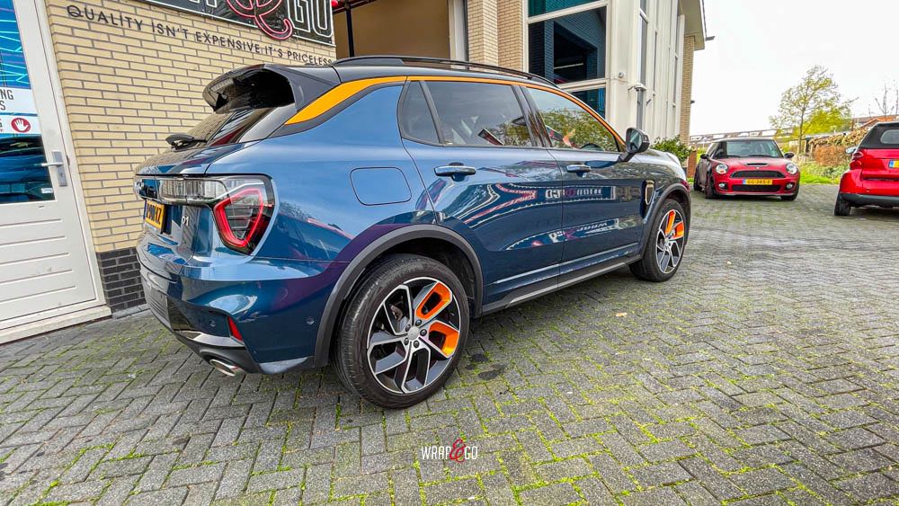 De standaard lichtblauwe accenten zijn met chrome delete vervangen door Avery Satin Metallic Stunning Orange, wat de Lynk & Co een opvallende look geeft.