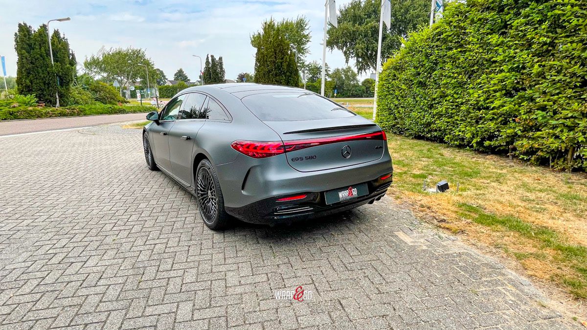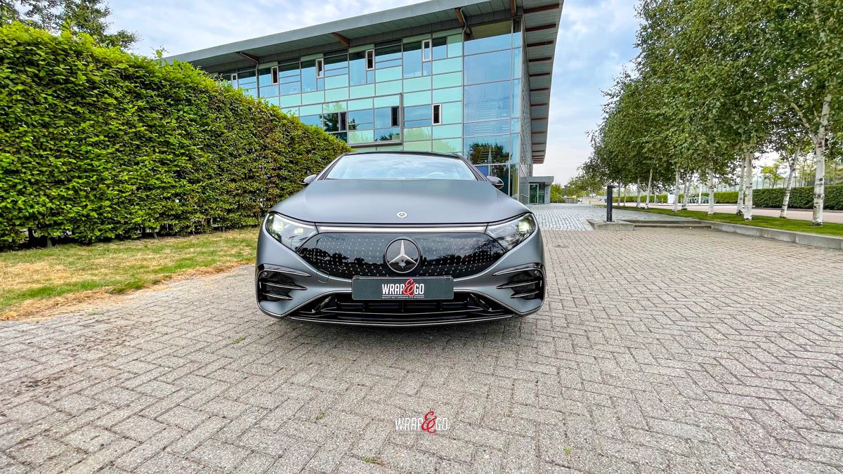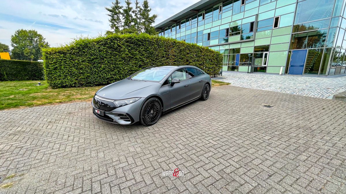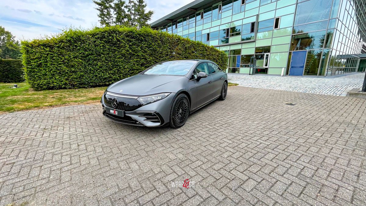 Deze Mercedes EQS hebben we gewrapt in PWF Matt Dark Charcoal. De matte charcoal-kleur past perfect bij het strakke, futuristische design van de EQS en geeft ’m een rustige maar super krachtige uitstraling. Door de matte finish lijken de lijnen nog strakker en komt de auto extra “clean” over, zeker in combinatie met de donkere details en velgen.