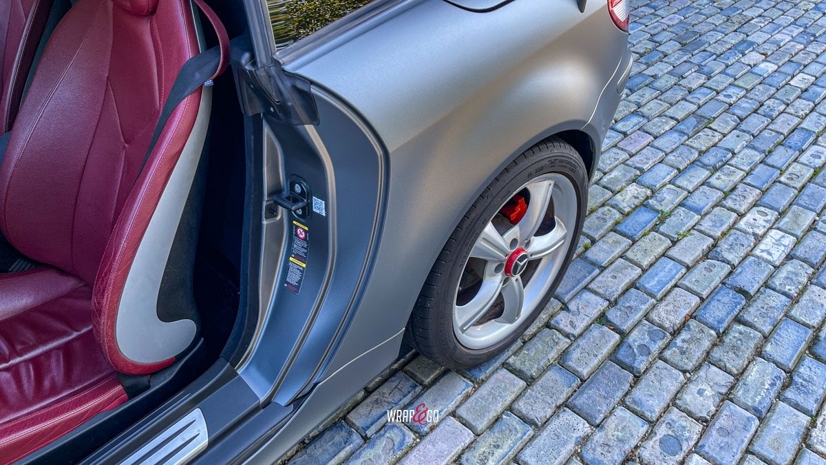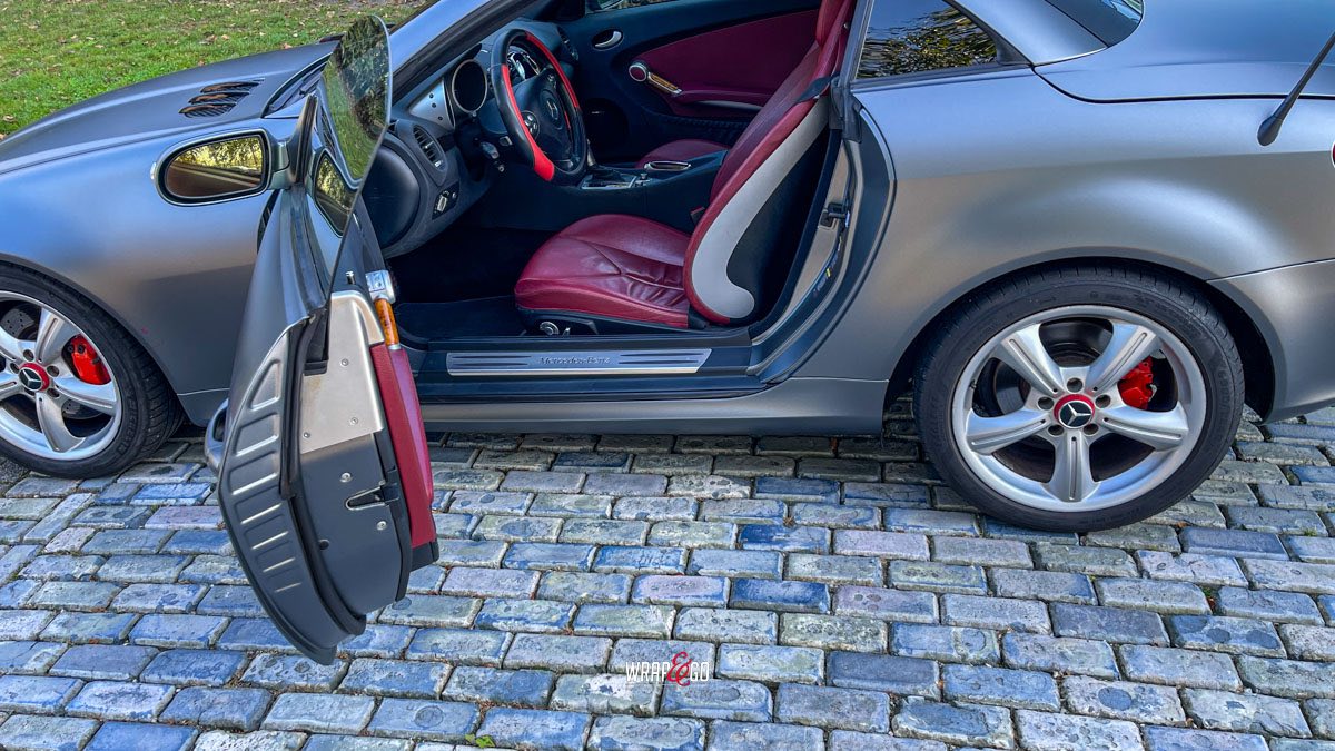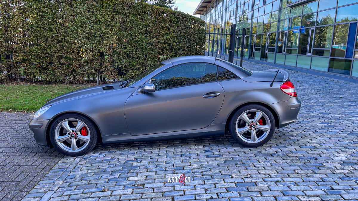 Deze Mercedes SLK is volledig gewrapt in Metamark Urban Steel, een stoere matte grijstint die het sportieve karakter van deze roadster krachtig benadrukt. De wrap geeft de auto een moderne, industriële look en laat het gespierde lijnenspel van de SLK nog beter uitkomen.