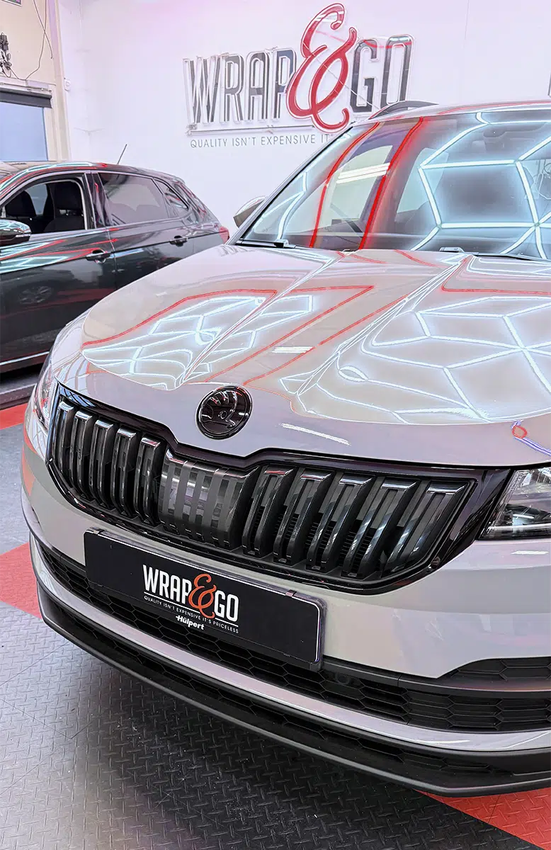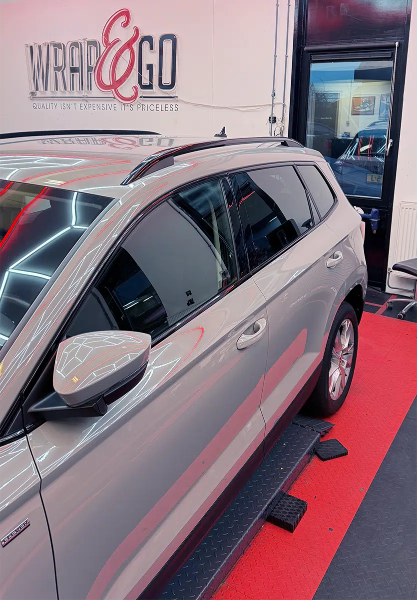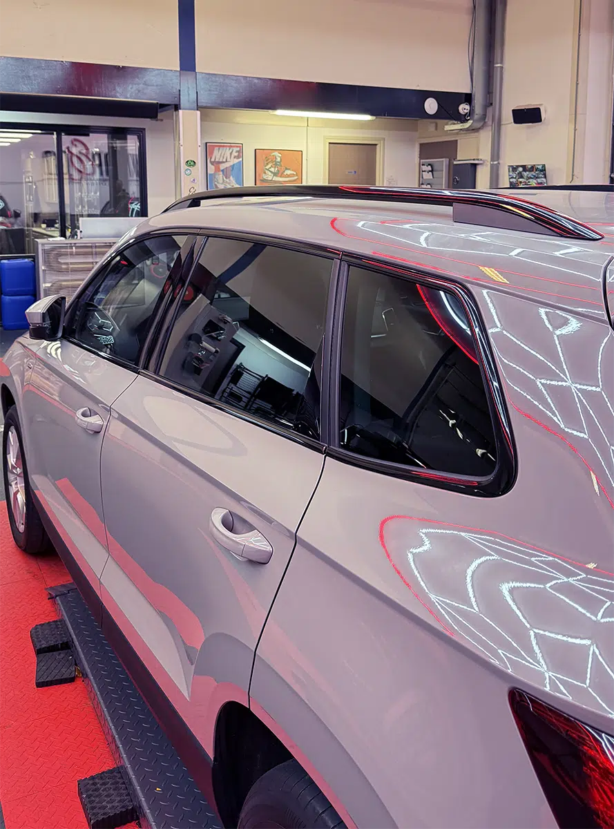 Voor deze Škoda Karoq hebben we een chrome delete uitgevoerd voor een strakkere en modernere uitstraling. De standaard chromen accenten zijn vervangen door hoogwaardige zwarte wrap, waardoor de SUV direct een sportiever karakter krijgt.