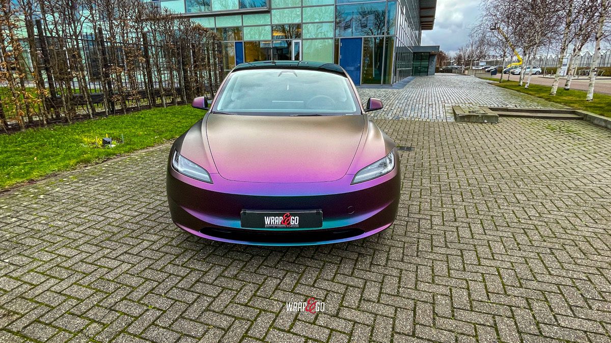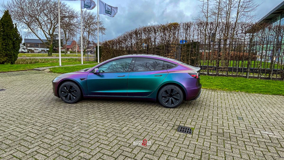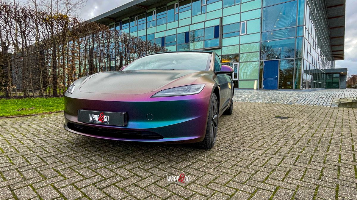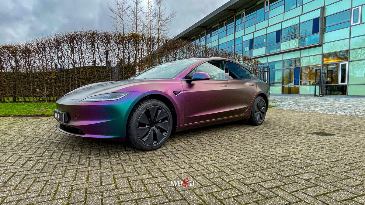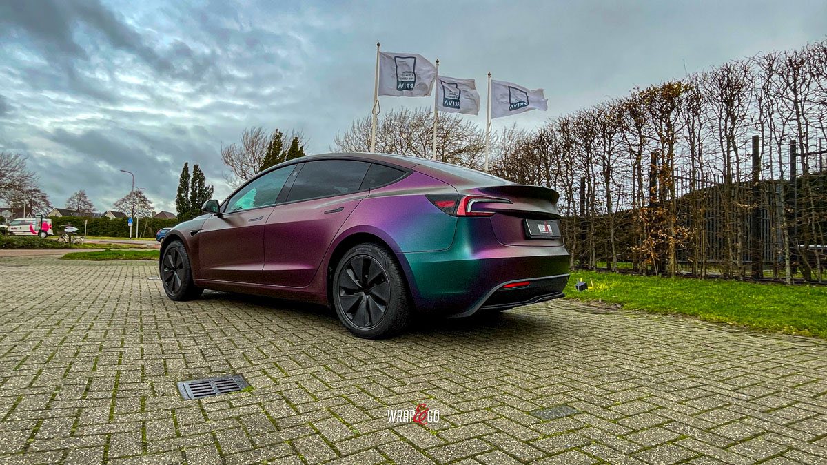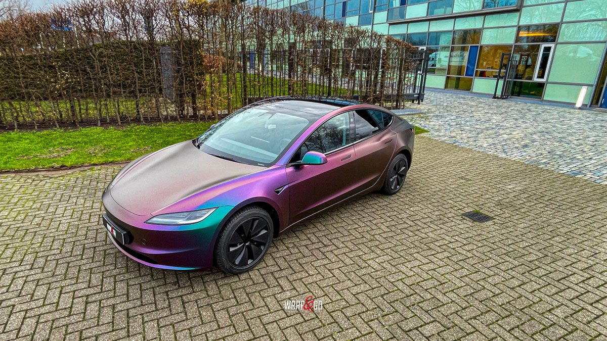 Deze Tesla Model 3 is gewrapt in de spectaculaire kleur Avery Satin Lightning Ridge, een kleurverschuivende folie die afhankelijk van de lichtinval overloopt van paars en groen naar brons en blauw. De satijnachtige afwerking versterkt het unieke kleurenspel en geeft de auto een futuristische en high-end uitstraling.