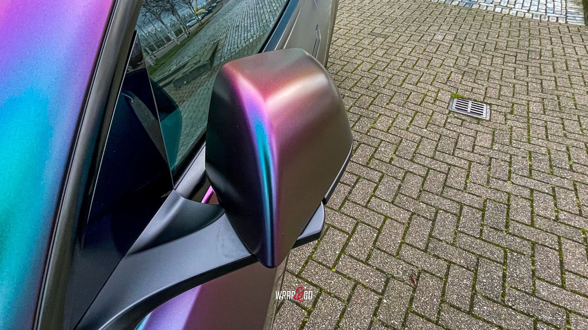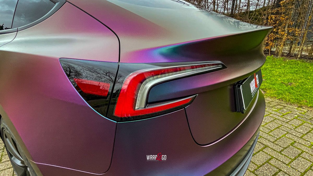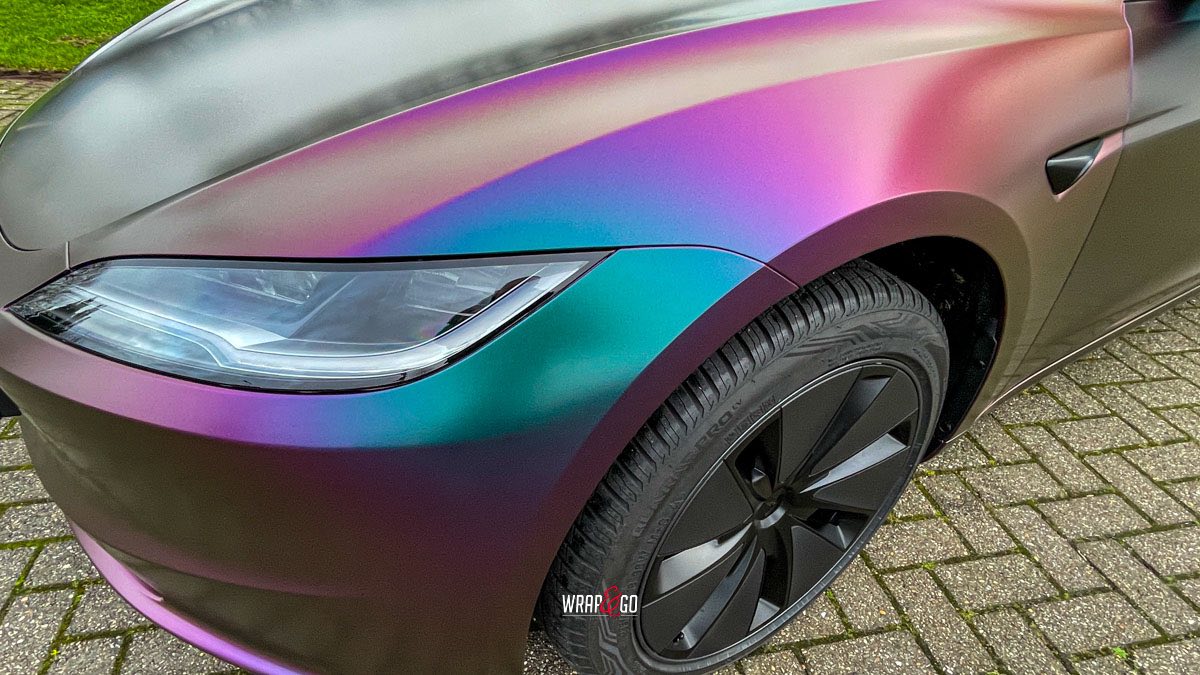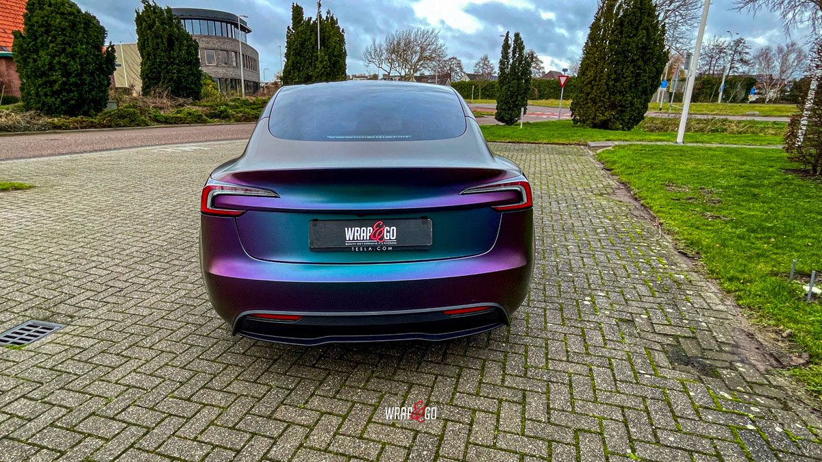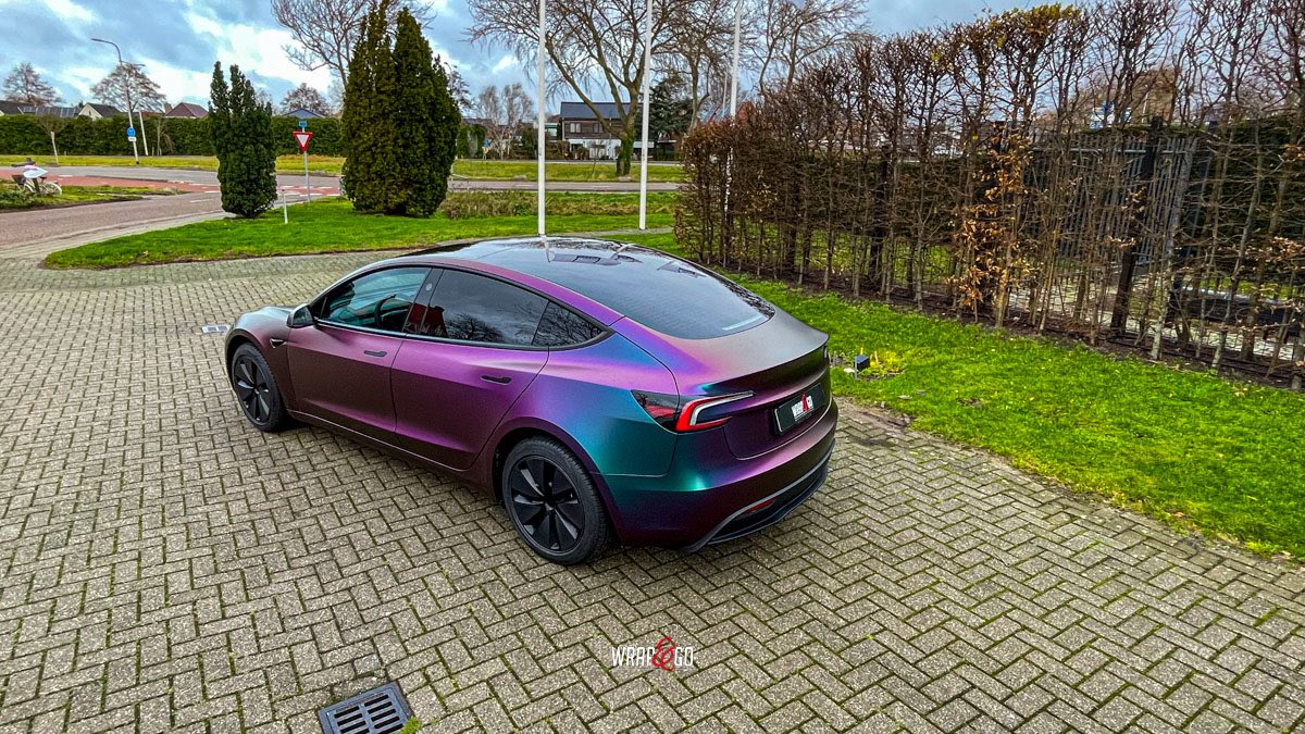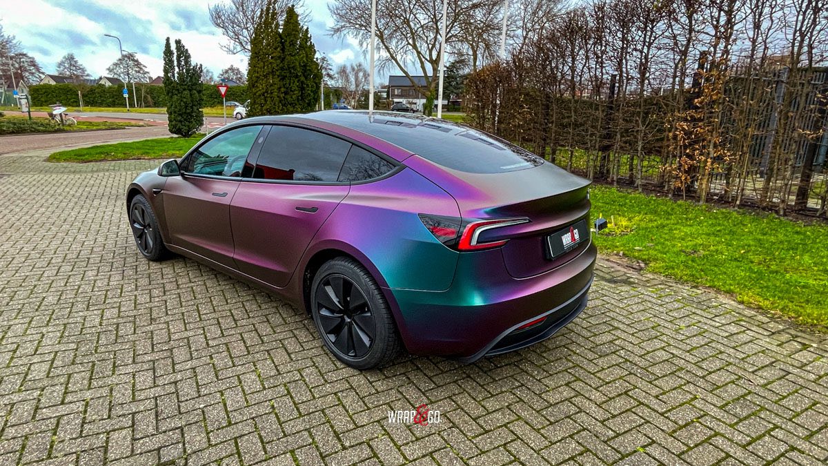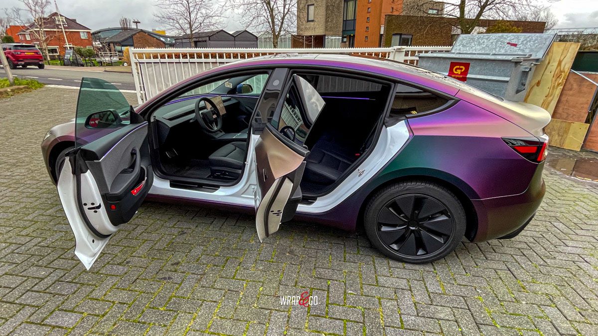 Deze Tesla Model 3 is gewrapt in de spectaculaire kleur Avery Satin Lightning Ridge, een kleurverschuivende folie die afhankelijk van de lichtinval overloopt van paars en groen naar brons en blauw. De satijnachtige afwerking versterkt het unieke kleurenspel en geeft de auto een futuristische en high-end uitstraling.