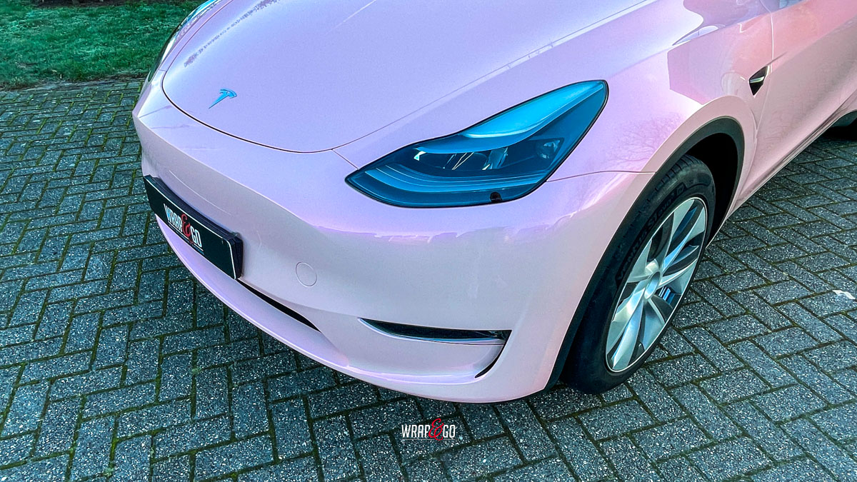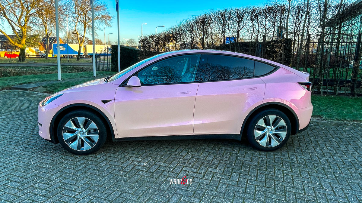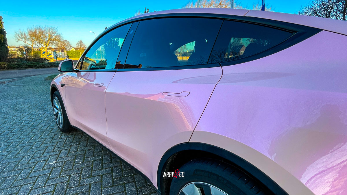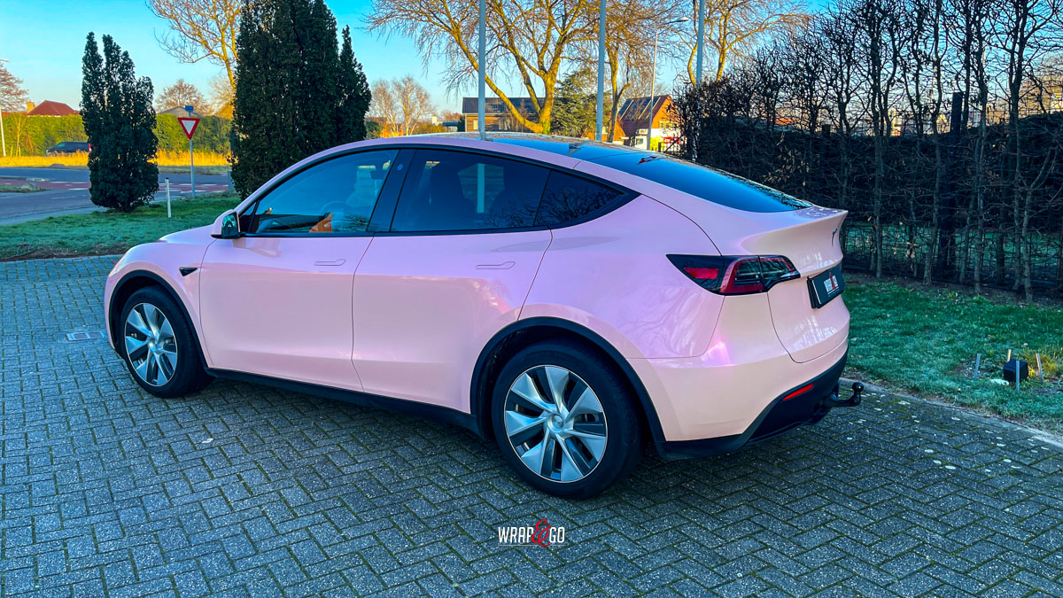De zachte roze kleur verandert subtiel met de lichtinval en geeft het elektrische karakter van de Tesla een vrolijke, persoonlijke twist. Tegelijkertijd biedt de hoogwaardige folie bescherming tegen krassen, steenslag en UV-straling, waardoor zowel stijl als duurzaamheid worden gecombineerd.