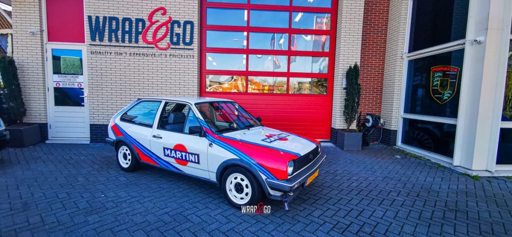 Deze klassieke Volkswagen Polo is omgetoverd tot een echte eyecatcher met een volledige Martini Racing design wrap. De iconische kleurencombinatie van rood, blauw en lichtgrijs is zorgvuldig aangebracht in vloeiende stripinglijnen die perfect aansluiten bij het retro-karakter van deze compacte hatchback.